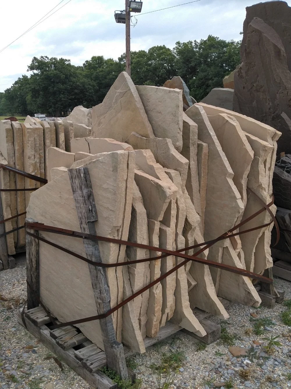 Flagstone is a quarried sandstone that comes in different thicknesses ranging from 3/4″ to 3″ thick. These irregular stones are used in a variety of applications from veneering walls and fireplaces to patios and walkways.